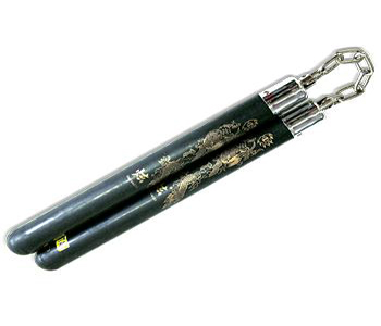 O nunchaku tem origem em uma ferramenta antiga usada por camponeses no trato do arroz. Quando usado em combate, o nunchaku provê primeiramente a vantagem de um alcance maior para os ataques, se comparado a um combate desarmado, e grande capacidade de danos por concussão. Apesar de considerado difícil de controlar por muitos, a corda ou a corrente do Nunchaku tem o benefício de permitir ataques de vários ângulos, tornando-o uma arma versátil. bastão articulado em três partes; três pequenos bastões interligados com correntes. É uma das armas arquetípicas de kungfu
