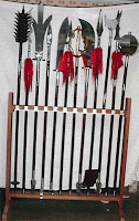 Alabarda (Kwan Tao) - Arma longa, pesada, produzida em madeira com partes metálicas (lâmina e bulbo) em ferro, bronze ou aço. Contundente, perfurante e cortante. Associada ao guerreiro divinizado Kwan Kung.
